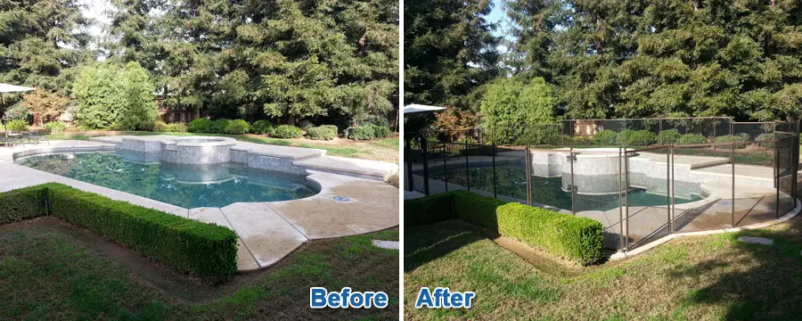 We installed this 4' removable pool fence in Fresno. The fence is made out of our most transparent material, black mesh and features our popular brown trim. This removable pool fence creates a "U" shape around the pool providing a safe barrier to keep small children out of the pool when playing in the yard.