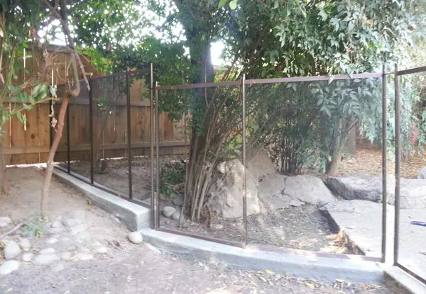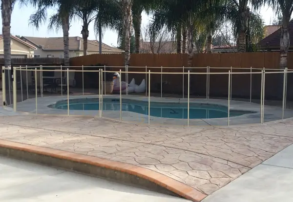 In this Central Valley removable pool fence, we installed a step down after the concrete line to ensure minimal gaps and ultimate safety.