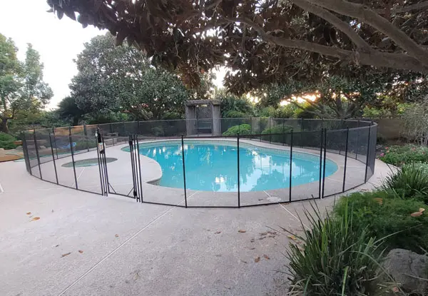 This removable pool fence in Fresno features our 4' Black Mesh with Brown Trim; it completely surrounds the pool while allowing free access around the outside of the fencing system. Attractive and functional, the customer was very happy with the results.
